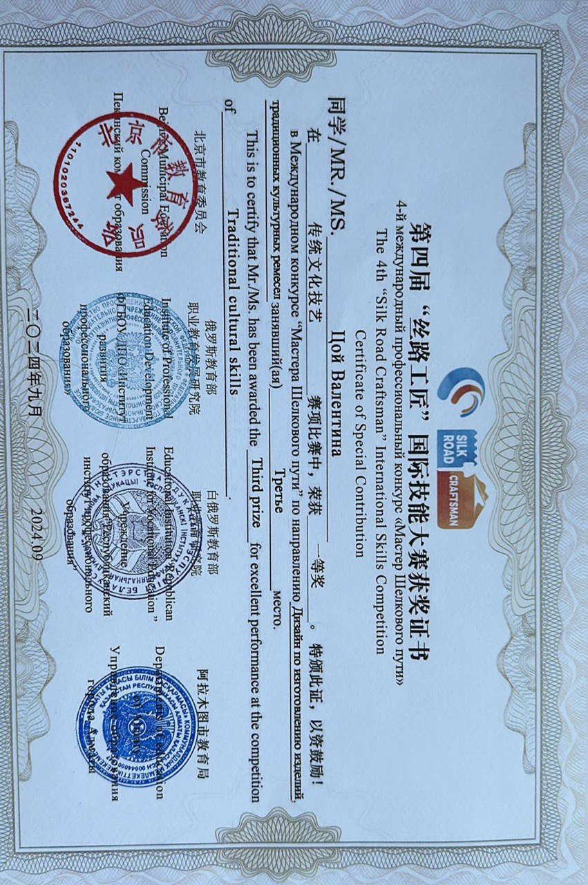 Студентка группы МК31, Цой Валентина, заняла третье место в 4-международном профессиональном конкурсе «Мастера Шелкового пути» в номинации «Дизайн изделий традиционных культурных ремесел».
